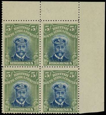 1913-7 5/- Head Die II, perf 15. Top right corner block of four variant in blue and sage-green, very fine o.g., the left pair sharing a pencil tick on the reverse. A very rare shade, believed to be unique as a multiple; ex Gibbs and Vestey. SG 251, AH 2