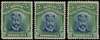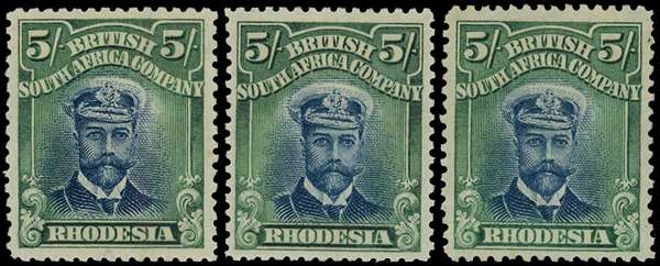 1913-7 5/- Head Die II, perf 14. Three large part o.g. examples in deep blue and light bluish green, good shades, fine. SG 239, AH 3(A)