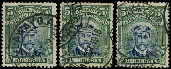 1913-7 5/- Head Die II, perf 14. Three fine used examples in steel-blue and deep dull green, shades, fine. One with inkmark on reverse. SG 239a, AH 6