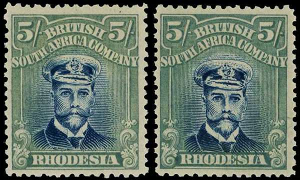 1918-21 5/- Head Die IIIB, perf 14, toned paper. Two large part o.g. examples in Handbook shades (A) and (B). SG 275, AH 9(A, B)