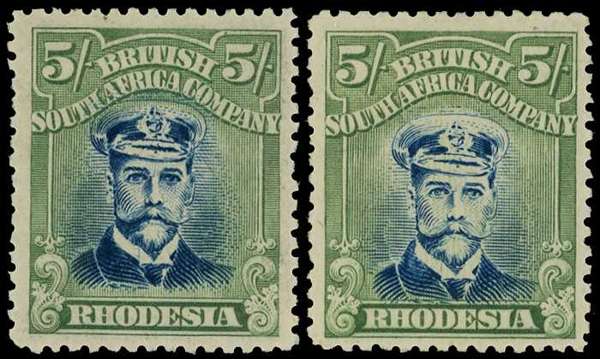 1918-21 5/- Head Die IIIB, perf 14, toned paper. Two large part o.g. examples in steel-blue and dull yellowish green, characteristic underinked 'ghostly' portrait. Contrasting shades. One with slightly short perfs. SG 276a, AH 10 ('Rare')