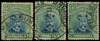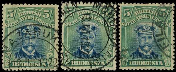 1918-21 5/- Head Die IIIB, perf 14, toned paper. Three used examples showing pale vignette (variant B, see Handbook), good shades; Mazabuka, Mongulealui and Filabusi CDSs, the latter with a couple of short perfs and frame slightly suffused. SG 276, AH 11(B)