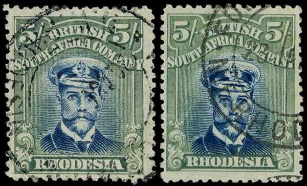 1922-4 5/- Head Die IIIB, perf 14, white paper. Two used examples in shades of steel-blue and deep bluish green, both fine. SG 306, AH 12(A)