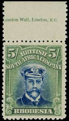 1922-4 5/- Head Die IIIB, perf 14, white paper. Top marginal o.g. example with part imprint, in deep blue and yellowish green, hinged on the selvedge only leaving the stamp unmounted. SG 307, AH 14a