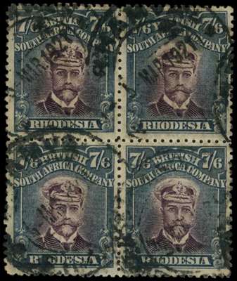 1913-7 7/6d Head Die II, perf 14. Used block of four in deep dull purple and (indigo) slate-black, fine, the C variant with fuzzy scrolls. Rather heavy Shamva CDSs of 5 MAR 21, the whole slightly aged but an extraordinary multiple, ex Livermore, Gibbs and Michael. SG 240, AH 1(C)
