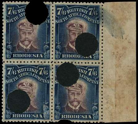 1913-7 7/6d Head Die II, perf 14, from Plate 3 State 2. Marginal block of four in deep dull purple and black, from the file sheet; usual condition with large punch holes, staining and colour run. R3-4/9-10. SG 240 group, AH 2(B)