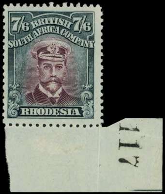 1922-4 7/6d Head Die IIIB, perf 14, white paper. Unmounted o.g. example in maroon and indigo, bottom marginal, attached piece of side selvedge with sheet number 117. SG 308, AH 6