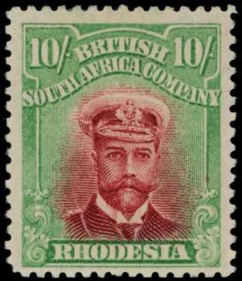 1913-7 10/- Head Die II, perf 14. Part o.g. example in deep rose-red and light green. Pinkish blur on reverse, as described in the Handbook. SG 241, AH 1(B)