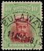 1913-7 10/- Head Die II, perf 14. Used example in carmine-lake and intense yellowish green, very fine, Bulawayo CDS 11 MAR 18. From a late state of Plate 4 with flaws in King's cap. SG 241a, AH 3