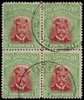 1913-7 10/- Head Die II, perf 14. Used block of four in carmine-lake and intense yellowish green, 1917 Regd. Bulawayo CDSs. R1-2/1-2 with R1/1 having flaw at the side of the King's nose, 1/2 'shotgun blast' to cap, and 2/1 large flaw on the end of the King's nose. The only known used block, some trivial toned spots on reverse otherwise very fine. SG 241a, AH 3