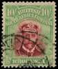 1913-7 10/- Head Die II, perf 14. Fine used example (virtually full gum so with strong colours) in carmine-lake and bright green. Collar flaw, and triangle of dots above and to right of cap badge. SG 241a, AH3 ('Rare')