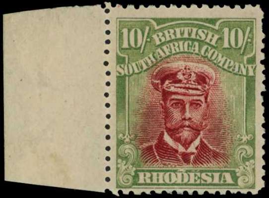 1917-20 10/- Head Die IIIA, perf 14. Unmounted o.g. example in carmine-lake and dull yellowish green, with severely-misaligned perfs, left marginal. Short perf at right which may, of course, be down to the perforating head. SG 255q, AH 4(B)