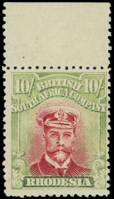 1922-4 10/- Head Die IIIB, perf 14. Top marginal example in crimson and bright yellow-green (unusual light green frame), centred right, a couple of short perfs at base. SG 309, AH 8