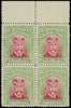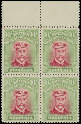 1922-4 10/- Head Die IIIB, perf 14. Unmounted o.g. top marginal block of four in bright crimson and dull yellow-green, heavily-inked portrait, the top selvedge showing a row of blind perforations. Fine and rare, ex Gibbs and Vestey. SG 309a, AH 9(A)