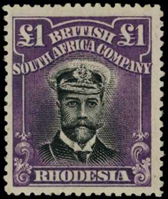 1913-7 £1 Head Die II, perf 15. Large part o.g. example in black and 'vivid' plum, some gum loss at top, still fine and very scarce. SG 254, AH 3(A)