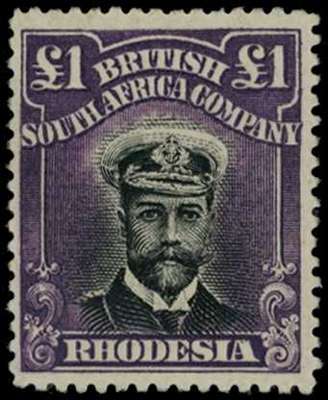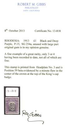 1913-7 £1 Head Die II, perf 15. Large part o.g. example in black and deep purple, fine, with beta flaw and R6/9 dot in cap badge. Gibbs Certificate (2013). SG 254a, AH 3(B)