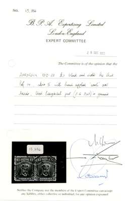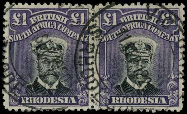 1913-7 £1 Head Die II, perf 14. Horizontal pair in (silvery) grey-black and lilac (clear scrolls) with Victoria 11 SEP 20 CDS, showing a different flaw at top of King's cap on each, also handpainting above cap. BPA Certificate (1983), an extremely rare used multiple, ex Gibbs and Michael. SG 242 var