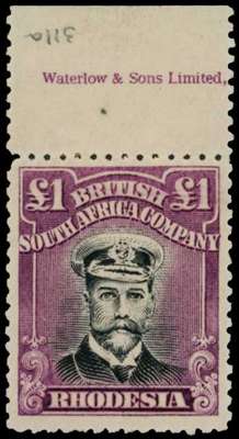 1922-4 £1 Head Die IIIB, perf 14, white paper. Large part o.g. example in jet-black and (bluish) deep reddish purple, top marginal with part imprint, light hingemark on selvedge just touches the stamp. Ex Gibbs, Baillie and Vestey. SG 311a, AH 18