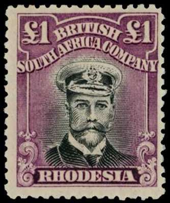 1922-4 £1 Head Die IIIB, perf 14, white paper. Large part o.g. example in jet-black and (bluish) deep reddish purple, fine and very scarce. Flaw on tip of left scroll. SG 311a, AH 18