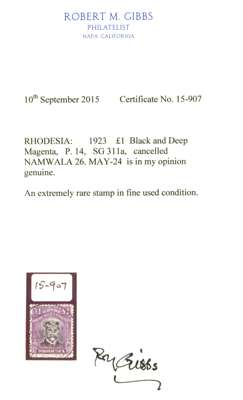 1922-4 £1 Head Die IIIB, perf 14, white paper. Used example in jet-black and (bluish) deep reddish purple, Namwala CDS of 26 MAY 24. A rare stamp in used condition, some blunt perfs at base otherwise very fine, with gum so that colour is unfaded. Gibbs Certificate (2015). SG 311a, AH 18