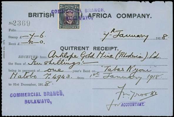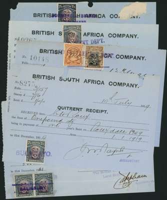 Fiscal uses. Six Quitrent receipts, five with single 7/6ds, the other with Arms 5/- and Admiral 2/- dated 1918-21, various cancels, one ex Danny Swart