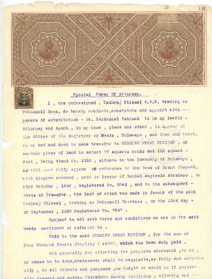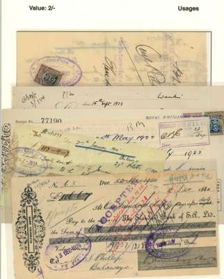 Revenue usages. 1914-22 small group of promissory notes (3), cheque and Power of Attorney, all with Admirals, one in combination with S. Africa Revenues. 3d pair, 6d + 2/6d, 1/- pair, 2/- (three, one damaged), useful group