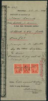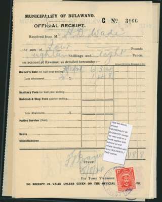 Revenue usages. Single Admiral 1ds on eight Receipts (mainly Bulawayo Rates receipts), various cancellations, and a strip of three on a transfer fee form