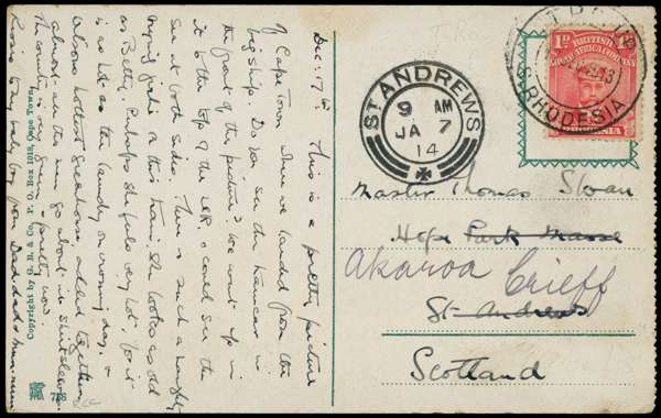 1913 ppc of Table Mountain bearing 1d Admiral, tied by very fine strike of TPO UP CDS of 17 DEC 13. Sent to St Andrews with arrival CDS. Rare. SG190