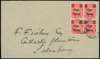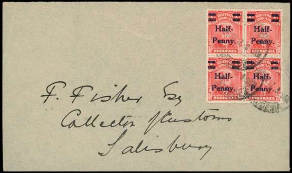 1917 locally-used envelope bearing block of four ½d on 1d rose-red (new setting with hyphen), partially unclear Salisbury CDSs of 5 NOV 17, fine