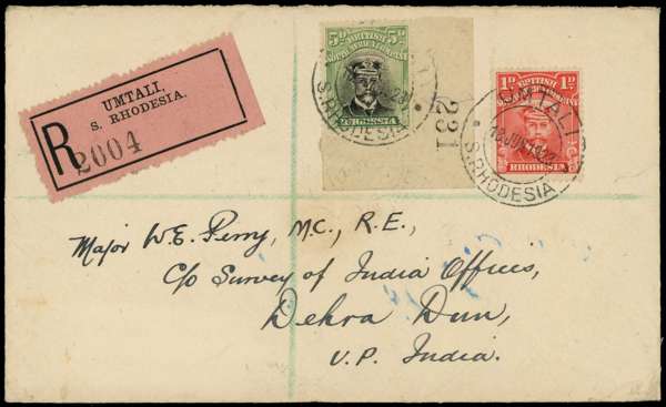 1918-21 5d Head Die IIIB, perf 14, toned paper. Nice registered cover to Dehra Dun, the 5d a corner example with sheet number 231 with 1d added to make up the Empire 1oz rate plus registration fee, Umtali CDSs of 19 JUN 23. Backstamped Salisbury and Dehra Dun. SG 264
