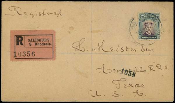 1918-2 8d Die IIIB, perf 14, toned paper, solo usage on cover to USA, 2½d rate for ½oz plus 4d registration, thus overpaid by 1½d. Salisbury CDS of 12 JUL 20. Central fold, some minor glue-staining, chiefly on reverse. SG 268