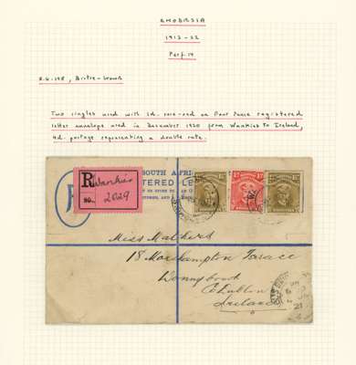 1920 4d postal stationery envelope to Ireland bearing Admiral 1d and 2 x 1½d, light Wankies CDS s of 6 DEC. Handwritten registration label, unusual. The 4d postage represents double weight. On John Michael's album page