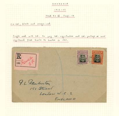 1921 registered envelope from Gwelo to P.L. Pemberton, indistinct CDSs of 7 NOV 21, bearing Head Die IIIB 4d and 6d. Registration etiquette is handwritten in red ink. Central fold. On John Michael's album page