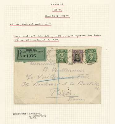 1921 registered envelope to Paris with two ½ds and 6d Die IIIB, Broken Hill CDSs of 28 NOV. A couple of small stains on the envelope, still fine, on John Michael's album page