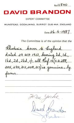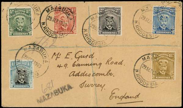 1923 registered cover to Surrey bearing ½d, 1d, 1½d, 2d, 2½d and 1/- with Mazabuka CDSs of 29 SEP 23. All the stamps are perf 15 (SG 202, 205, 206, 208, 312 and 317), the 2d and 1/- from the late 1923 printings which were never sent to Rhodesia; thus the cover 'by favour', but nonetheless exceptional and rare. Central fold, clear of adhesives. Brandon Certificate (1987), ex Danny Swart