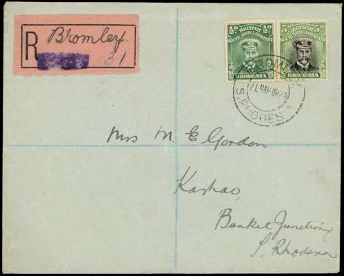 1923 registered philatelic cover to Banket Junction with ½d blue-green and 5d Die IIIB, Bromley CDS of 21 MAR. The registration label is plain with a pre-printed number obliterated with a violet bar, with 'Bromley' and '31' in manuscript. Has been roughly torn open, affecting the backflap (which is, however, still there). Very scarce use of a 5d Admiral on a domestic registered cover