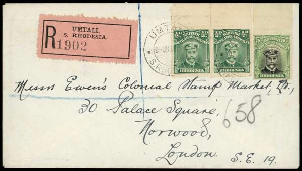1923 registered cover to Messrs Ewen's in Norwood, bearing top marginal pair of ½ds and 5d Die IIIB, Umtali CDSs of 9 JUN. Attractive