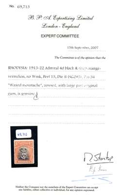 1913-7 4d Head Die II, perf 15. A very fine example with large part o.g., showing R4/4 'waxed moustache' and small part printer's mark at upper left. Fresh. BPA Certificate (2012), ex CRL March 1992 and Vestey. SG 245a. Rare.