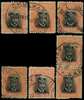 1917-20 4d Head Die IIIA, perf 14. Deep black and reddish orange group, five used singles and a vertical pair (the lower stamp damaged), odd perf fault, range of shades. SG 255d, AH 6(B)