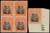 1922-24 4d Head Die IIIB, perf 14, white paper. Block of four in black and orange-red, large part o.g. with slightly patchy gum, the lower pair unmounted. Also a corner single with sheet number 416, unmounted o.g., natural gum crease. SG 294, AH 15a