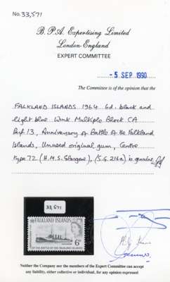 1964 Battle of the Falkland Islands 6d black and light blue, the celebrated “H.M.S. Glasgow” error of vignette, pristine unmounted mint with full o.g. Undiscovered until 1970, around ten examples are known in unmounted condition. One of the great stamps of the British Commonwealth, accompanied by BPA Certificate (1990). SG 216a, £40000