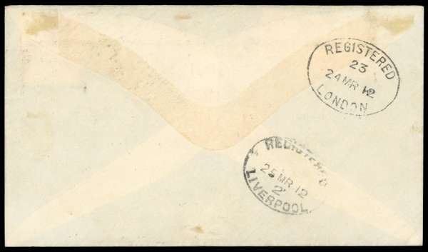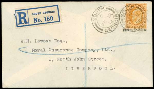 South Georgia. 1912 Lawson registered cover with KEVII 6d tied by Type Z2 underprint and South Georgia CDS Type SG1, another strike alongside. Backstamped London and Liverpool. The envelope with trivial wrinkling, still fine and a pretty cover. SG ZU3, £1000