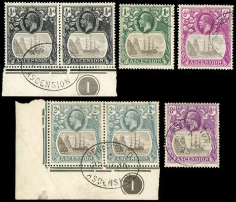 1924-33 ½d (in marginal pair with plate number). 1d, 2d (corner pair with plate number), 6d and 8d, each with R5/1 cleft rock; a couple with very slightly short perfs, otherwise fine. SG 10c/17c, £2625