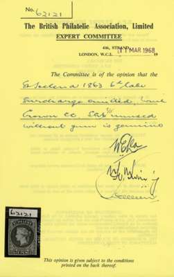 1863 (1d on) 6d lake, surcharge omitted, fine part o.g. The famous error from the bottom row of a sheet, positioned at R20/9 by the incomplete design at top right corner, adjacent to the example in the Royal Collection, which is from R20/8. Twelve existed but few survive. With BPA Certificate (1968) when SG 6, incorrectly stating ‘’without gum"; with impeccable pedigree, ex Ferrary and Hind. SG 3b, £18000