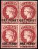 1863 1d lake imperforate block of four with large margins, large part o.g. The upper pair with surcharge Type A, the lower pair Type B; the right pair with an unobtrusive vertical crease, still a beautiful multiple of the highest rarity which would enhance any exhibit. Ex Jamestown & Ayre. SG 4a, £22000