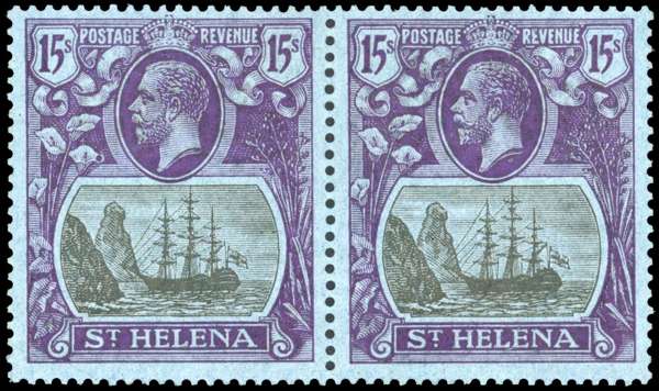 1922 15s grey and purple on blue paper. A fine o.g. horizontal pair, the right stamp with R4/6 torn flag. A rare multiple, ex the Jamestown & Ayre collections (Harmers 1989). SG 113, b, £10500