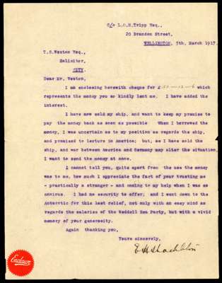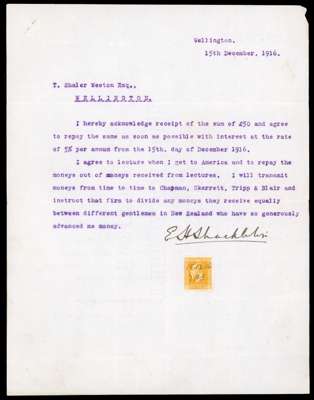 1914-6 British Imperial Trans-Arctic Expedition, three letters from Shackleton to a Wellington solicitor. The first item a signed formal receipt acknowledging a loan of £50, bearing a New Zealand 2d dated 15.12.16 and initialled EHS; the second item a handwritten letter of the same date, thanking him for “standing by me when things were bad for me”; the third item a typed letter dated 5th March 1917, referring to a cheque enclosed to repay the debt plus interest - “I have now sold my ship, and want to keep my promise to pay the money back as soon as possible….. (I have) a vivid memory of your generosity." Folds and minor creasing but a splendid trio