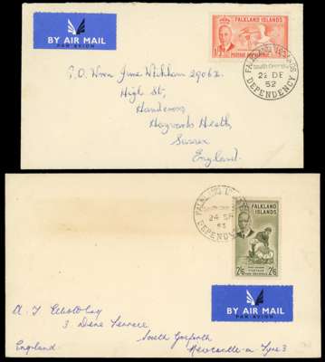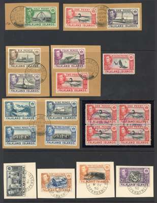 South Georgia. KGVI 1938-50 set on Hagner sheet with ½d to 1s (both 1ds, the first being carmine, and both 2ds) tied to five pieces; 1d vermilion block of four; 1s3d off piece, and the high values each on separate piece cancelled 9 DE 50, the 10s with a minor wrinkle otherwise all are fine. Also the 1952 1s3d and 2s6d on separate airmail covers to England.