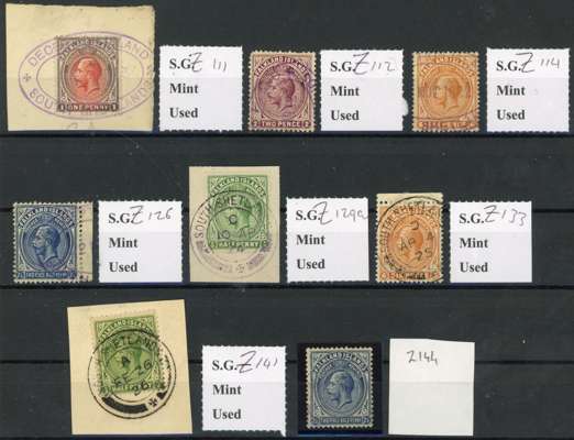 South Shetlands. 1912-29 group of eight postmark items. Oval Deception Island; SG Z111 (oxidised) on piece with full violet cancel, Z112 short perfs at top, Z114 and Z126 (one short perf). Circular South Shetland; SG Z129a on piece, Z133, Z141 on piece and Z144. A very good group, STC £1505