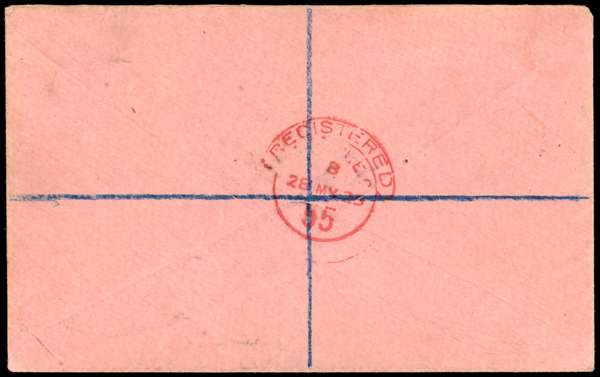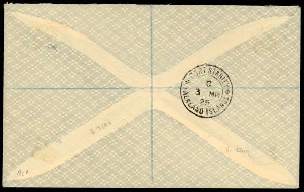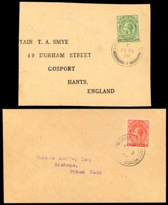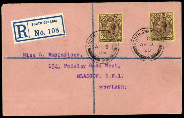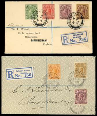 South Shetlands. 1927-9 four philatelic covers and a piece, all with Script watermark values. 1927 Wilson cover with ½d, 1d, 2d, 2½d purple on yellow; 1928 cover to Port Stanley with 2d, 6d, 1s; 1928 Capt Smye large piece with ½d, transit CDS on reverse indicating that this was the form in which it passed through the post; 1929 Southey cover with 1d (correct rate); 1929 cover to Glasgow with 2½d purple on yellow. All with Type B2 CDSs, three different registration labels. SG Z141-3, 145-7